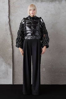 included with a boxy outerwear in sculptural fabrics like soft nudes. Embellishment